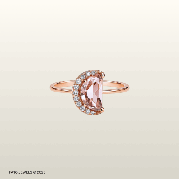 A delicate and contemporary ring crafted in 18K rose gold, featuring a unique half-moon design set with a soft, pastel 0.61ct amethyst. The center stone is beautifully framed by a crescent of 11 shimmering round diamonds, adding brilliance and contrast to the modern silhouette. Elegant, feminine, and artistic — a perfect everyday luxury piece or a meaningful gift.
