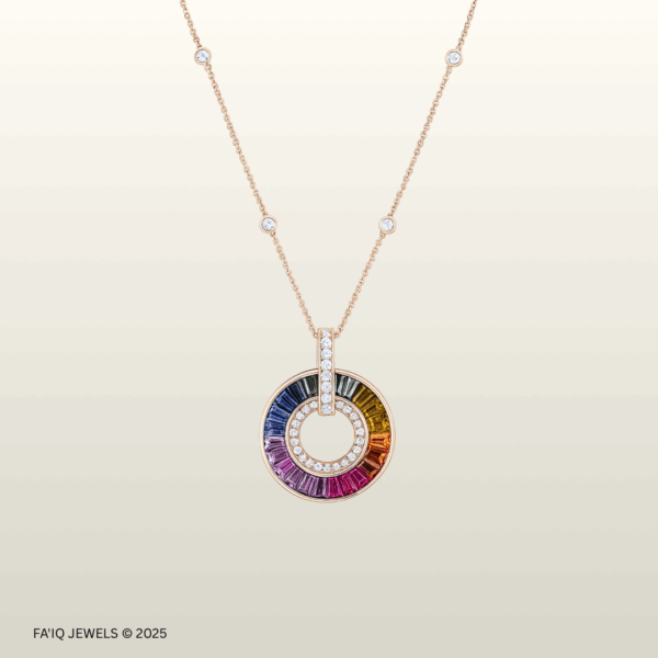 A vibrant and luxurious statement necklace crafted in 18K rose gold, featuring sparkling diamonds gracefully set along the chain. The pendant showcases an eye-catching circle design adorned with 31 multi-colour sapphires (4.07ct), radiating a rainbow gradient that symbolises joy, creativity, and individuality. Accented with 28 brilliant round diamonds on the pendant and 9 diamonds along the chain, this masterpiece brings together colour and elegance in perfect harmony.