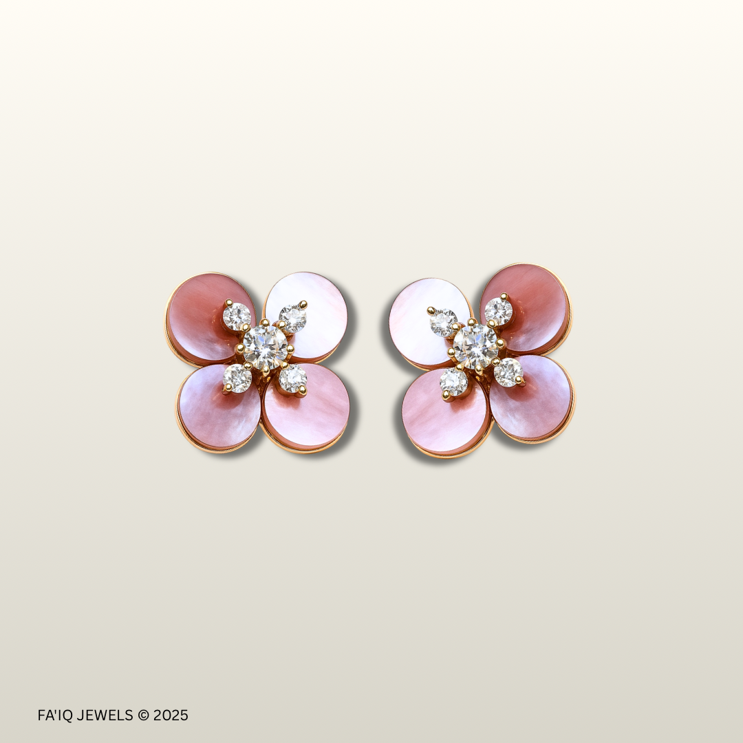 Elegant floral earrings crafted in 18K rose gold, designed with eight soft pink mother-of-pearl petals and accented by a sparkling cluster of diamonds at the centre. Feminine, timeless, and perfect for adding a gentle touch of luxury to any look.