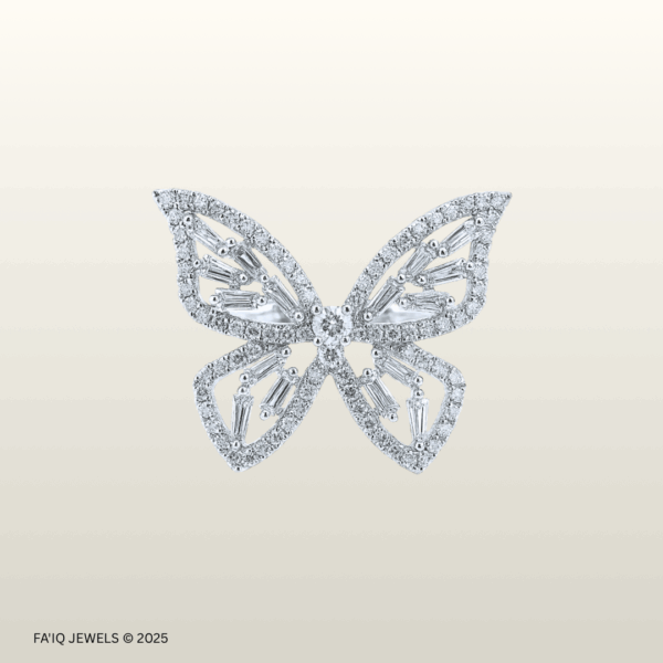 A stunning butterfly-inspired ring crafted in 18K white gold, featuring a delicate openwork design set with sparkling diamonds. With 77 round diamonds and 16 tapered diamonds, this piece captures light beautifully — elegant, feminine, and perfect for special occasions or statement styling.