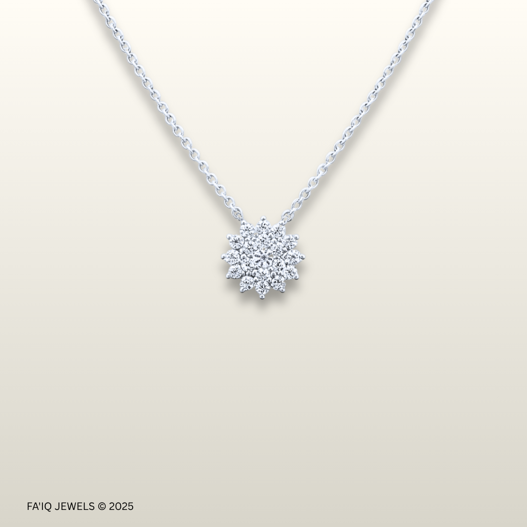 A radiant diamond cluster pendant crafted in 18K white gold, designed in a floral–starburst silhouette for maximum brilliance. Featuring 25 round diamonds arranged to create a striking burst of light, this necklace blends timeless elegance with everyday sparkle — perfect for gifting or refined daily wear.