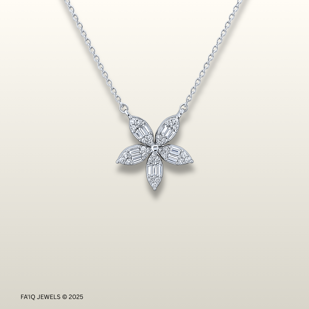 A delicate floral pendant crafted in 18K white gold, featuring a beautiful blend of round and baguette diamonds. Each petal is meticulously set to create a radiant bloom, offering feminine charm with refined brilliance. A graceful necklace perfect for everyday luxury, gifting, or special moments.