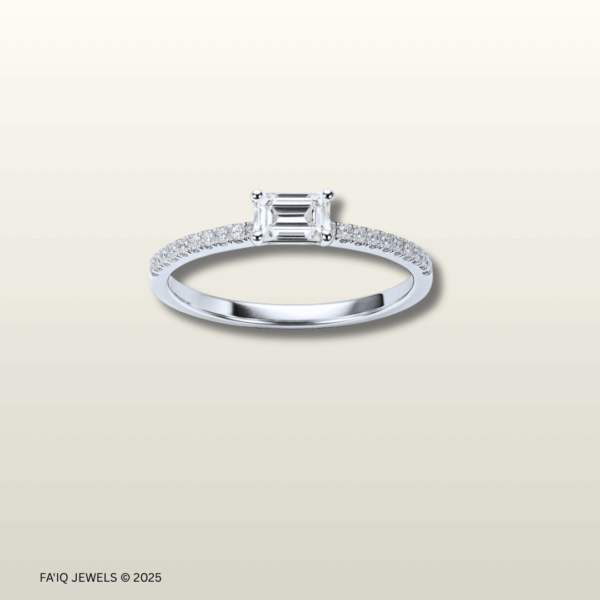 A refined and timeless solitaire ring crafted in 18K white gold, featuring a striking emerald-cut diamond as the centre stone. The clean, elongated facets of the emerald cut exude understated elegance, enhanced by a delicate pavé diamond band for just the right amount of sparkle. Perfect as a modern engagement ring or an elegant everyday piece.