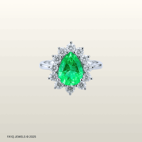 A captivating statement ring crafted in 18K White Gold, featuring a vivid 0.99ct pear-shaped emerald wrapped in a radiant floral halo of 12 sparkling diamonds. The rich green center stone contrasts beautifully against the brilliance of white diamonds, creating an elegant and timeless piece.