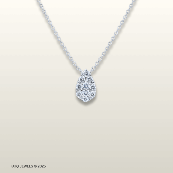 A timeless teardrop diamond pendant crafted in 18K white gold, featuring a cluster of brilliant round diamonds arranged for maximum sparkle. Elegant and feminine, this sophisticated piece shines beautifully from day to night — making it a perfect choice for everyday luxury or a meaningful gift.