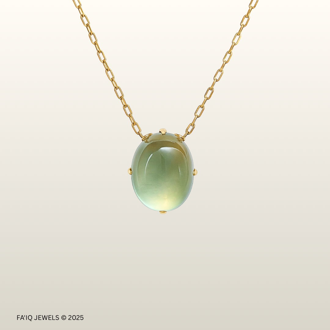 A refined and minimalistic necklace crafted in 18K yellow gold, featuring a single oval prehnite cabochon of exceptional clarity and size. Its soft green glow creates a calming, elegant look — perfect as a statement piece or for everyday sophistication.