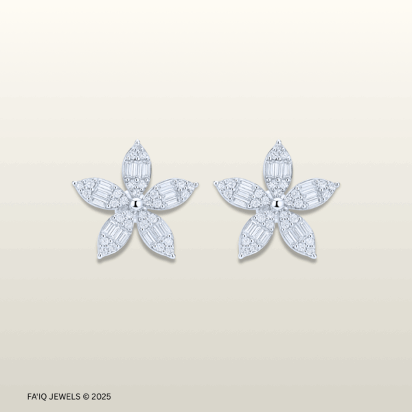 A delicate floral design crafted in solid 18K white gold, featuring a luxurious mix of round and baguette diamonds. Each petal sparkles with precision-cut stones, creating an elegant and feminine piece perfect for everyday luxury or special occasions. A timeless floral motif that brings grace, radiance, and charm to your look.