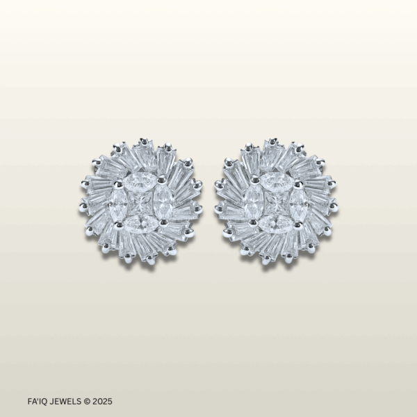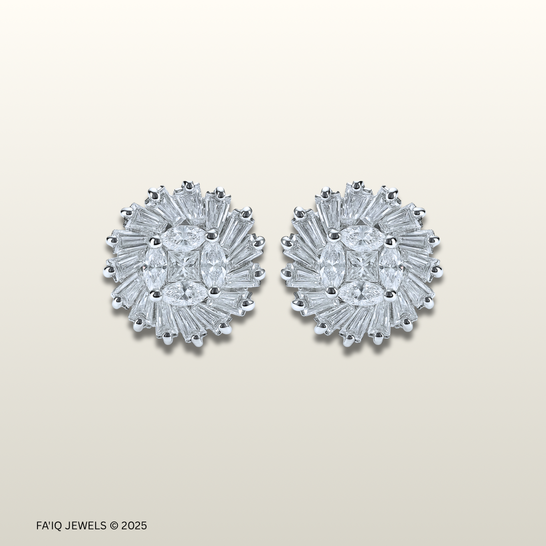 A dazzling starburst design crafted in solid 18K white gold, radiating brilliance from every angle. Featuring a stunning mix of tapered baguette, marquise-cut, and princess-cut diamonds meticulously arranged to create a full, dimensional sparkle. A statement piece designed for women who appreciate timeless glamour.